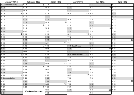 1892 calendar