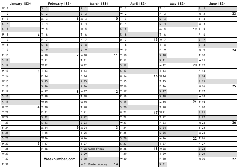 1834 calendar