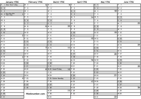 1706 calendar