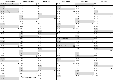 1892 calendar