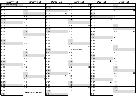 1652 calendar