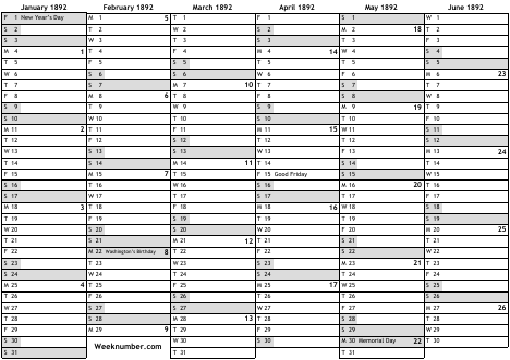 1892 calendar